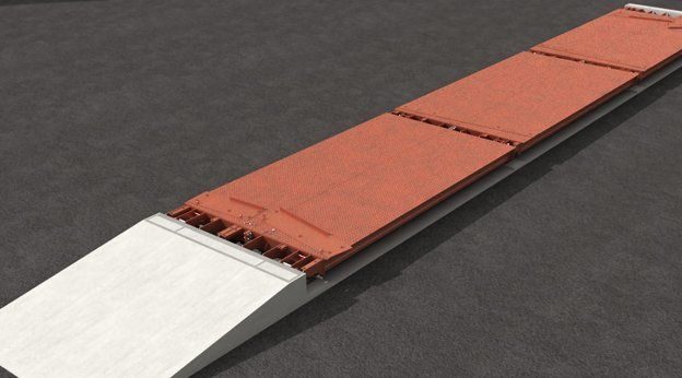 Pont bascule modulaire béton avec têtières omnidirectionnel, en version hors sol ou encastré. - Dimensions de 6 à 18 x 3 m selon modèle - Porté maximale de 30 à 60 T selon modèle - Hauteur : 310 mm (standard) ou 300 m (avec cuvelage) - Pont béton avec têtières métalliques - Peut ê
