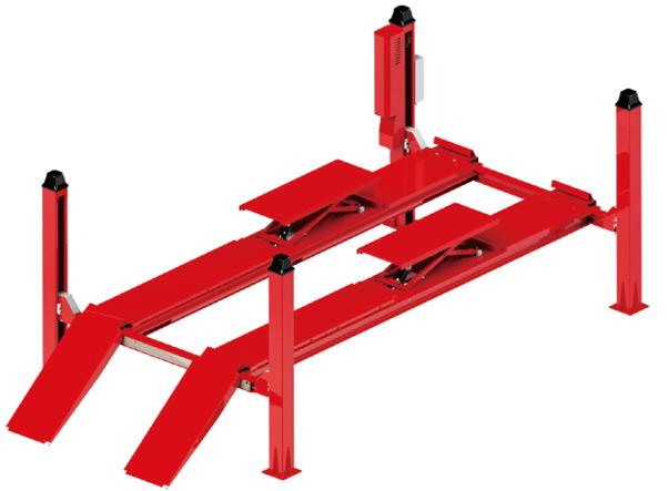 Pont élévateur à quatre colonnes pour alignement. Comprend un vérin central de 2T.Caractéristiques de sécurité : - Câble en acier et interrupteur de fin de course - Soupape de sécurité anti - explosion du système hydraulique - Plates - formes antidérapantes résistantes à l?usure pou