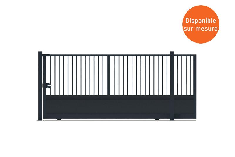 Le portail coulissant à soubassement est un produit destiné à l'usage professionnel. Ce modèle classique s'intègre facilement dans tous les environnements. Il convient aux usages à répétition d'une résidence, d'une entreprise ou d'un dépôt. Le remplissage à barreaux associé à un soubassement permet de sécuriser un passage et limiter l'intrusion d'animaux. Le soubassement a pour avantage de faciliter et réduire l'entretien. Conçu pour s'adapter à tous les terrains, il est vendu avec des poteaux à sceller ou sur platine.Le portail coulissant est livré avec un rail à visser, deux poteau ou portique de guidage et de réception.Dans le cas d'une ouverture manuelle, deux poignets avec serrure à crochet sont fournis. Pour une ouverture motorisée, la traverse est renforcée afin de s'adapter aux contraintes d'une motorisation.Plusieurs options sont disponibles sur demande pour ce modèle : Vantaux inégaux, ouverture sur pente, pivot roulement à billes, ossature en tube, trappe de visite, lisse défensive, mono vantail Jusqu'à 6 mJusqu'à 8 mJusqu'à 9 mJusqu'à 10 mJusqu'à 12 mJusqu'à 16 mOssature*60x60x2 mm80x80x2 mm80x80x3mm100x100x3 mmPoutre*120x60x3 mm160x80x3 mm200x100x3 mm200x100x4 mm200x120x5 mmMontant*60x60x2 mm80x80x2 mm100x100x2 mmGuidage*Poteau 100x100x3 mmPortique 100x100x3 mmPortique 100x100x4 mmRéception*Poteau 100x100x3 mmPoteau 120x120x3 mmRoues*120 mm160 mm200 mm *dimensions supérieures au-dessus de 2250 mm de hautDescriptif technique :