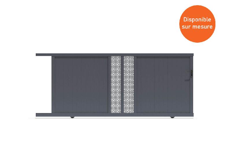 Télécharger la NoticeLe portail coulissant perforé est une pièce unique de la gamme moderne. Distingué et occultant, il sera habiller le jardin de votre maison traditionnelle ou contemporaine. Ce modèle est disponible en portillon afin d'être assorti à votre entrée.Sa conception associe un remplissage plein et une partie en tôle galvanisé perforé en R5T8. Ce système de perforation crée 30% de vide et donne une touche d'originalité tout en préservant la capacité occultante du portail. Livré avec :Le portail coulissant perforé est livré prêt à monter, le kit de montage se compose d'une platine de guidage, d'une pièce de réception en aluminium, d'une butée de fin d'ouverture et d'un rail. Avec l'option manuelle, deux poignées avec caches aluminium, une serrure à canon européen et trois clés sont ajoutés dans le kit.Avec l'option motorisable, il n'y pas de système d'ouverture manuel. La traverse inférieur est renforcée afin de pouvoir accueillir un moteur. Descriptif technique :