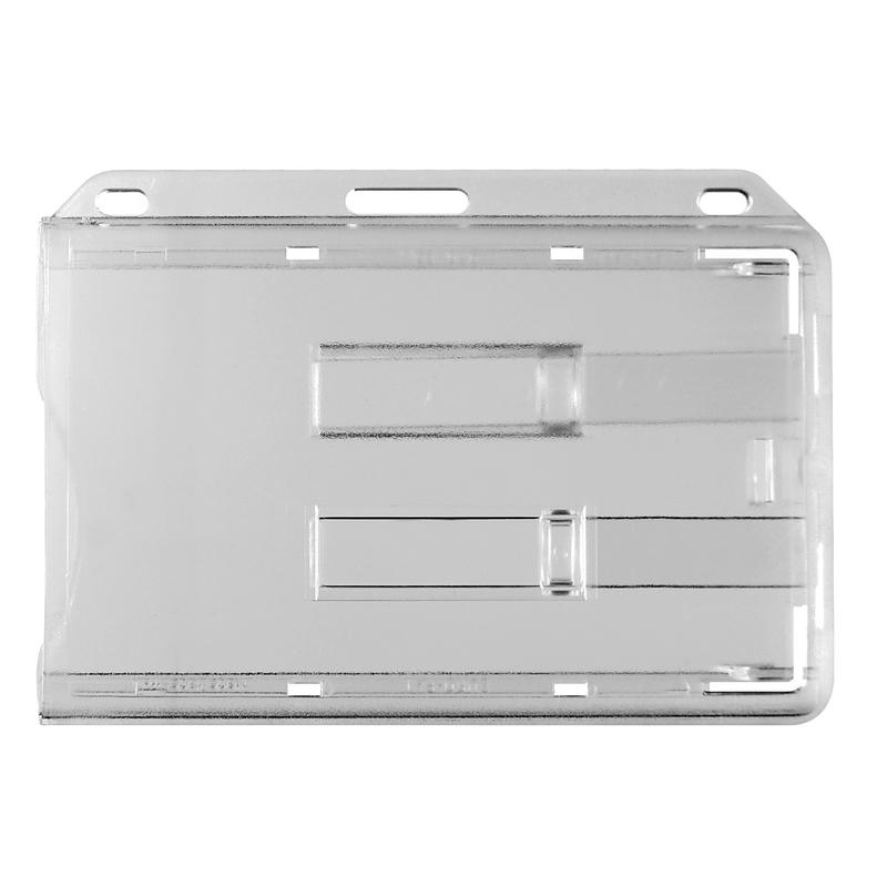 Porte - badge 2 cartes poussoir extraction - horizontal - Porte - badge rigide transparent en polycarbonate clair avec poussoir glissière pour extraction du badge. - Pour 2 badge, une face de chaque badge visible. - Ce porte badge est idéal pour les badge avec puce contact ou piste magnétique