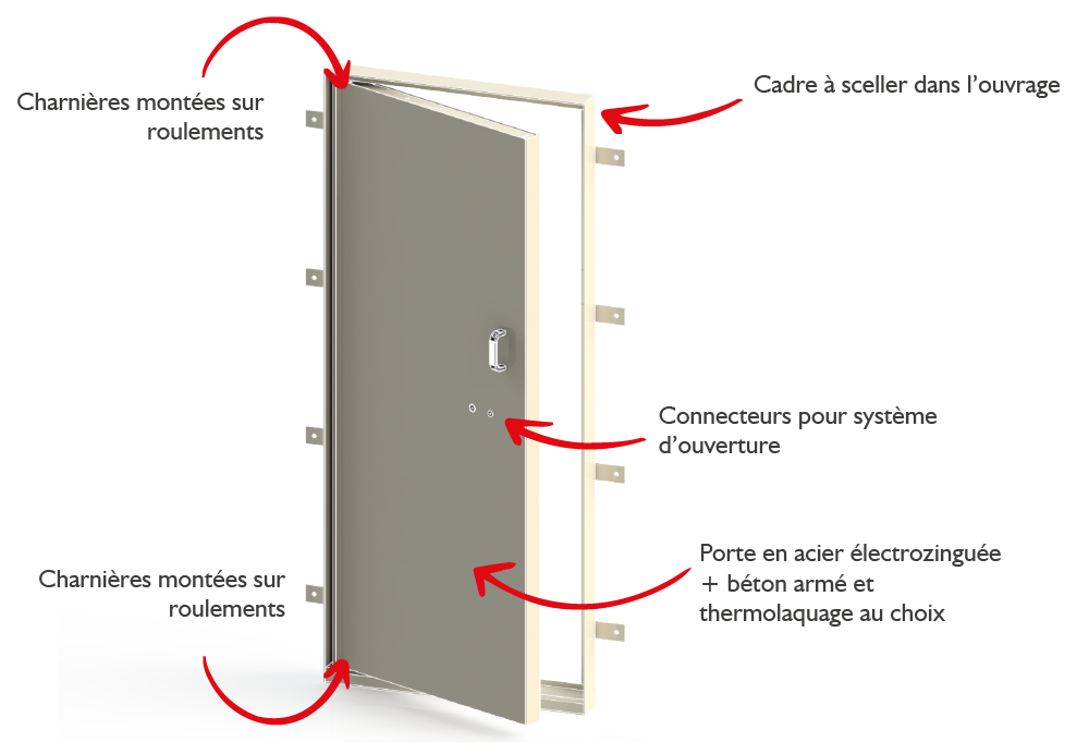 Notre porte blindée est montée sur roulement sans charnières apparentes. Elle peut être utilisée sur nos ouvrages mais également comme porte d’accès à