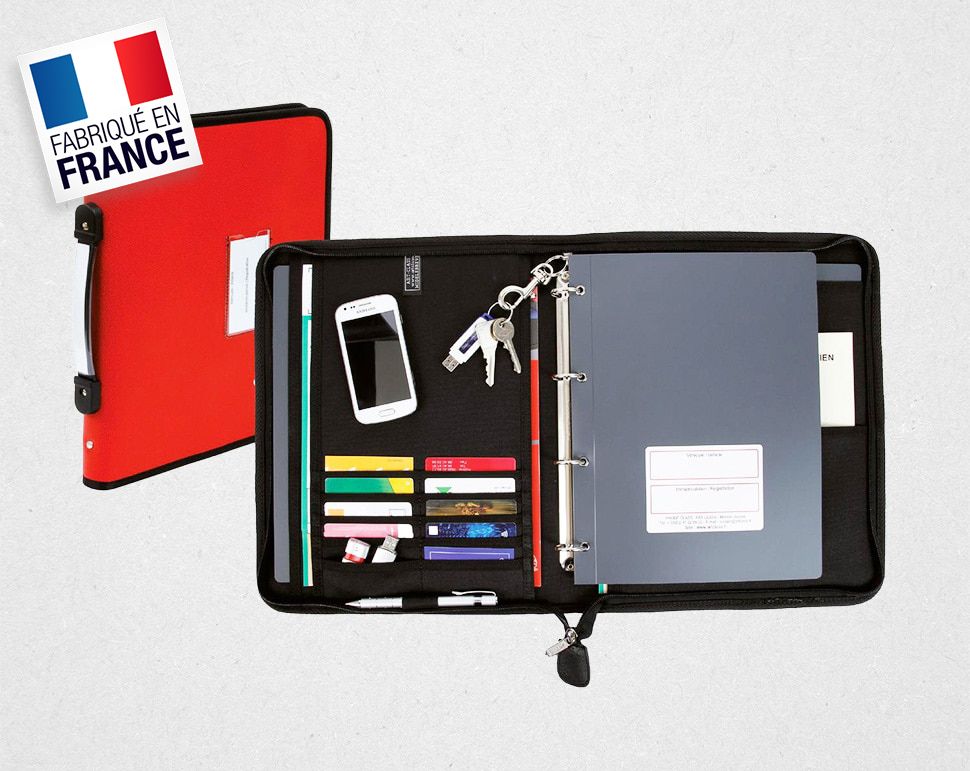 - Rangement à l’intérieur : 1 emplacement pour un stylo, des documents A5, une pochette sécurisée pour une clé USB (fermeture éclair, scratch, …), une poche A4 (voir plus grand pour contenir le dossier avec spirale) avec soufflet de 1-2 cm, 4 emplacements de carte de visite.