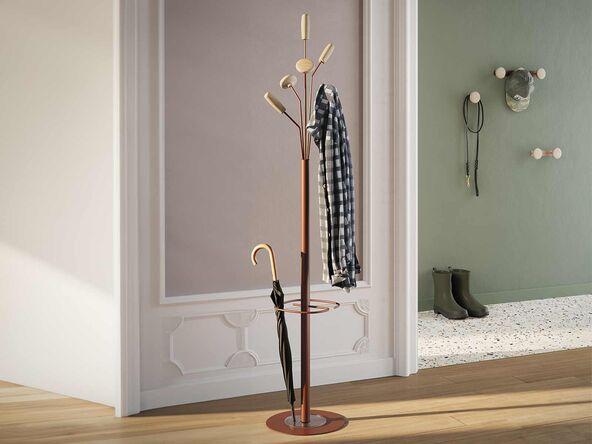 Porte-manteaux Manade. 18 coloris au choix. Hauteur 176,4 cm. Largeur 34 cm. 6 Patères en bois clair. Autoportant.