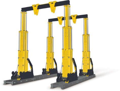 Leurs mâts télescopiques lèvent/déplacent des charges de 20 à 800 tonnes par roulage motorisé guidé sur pistes au sol. - Ils sont composés de 4 pieds indépendants gérés par 1 module de puissance avec pupitre de commande ou radiocommande. - capacité minimum : 20 tonnes.