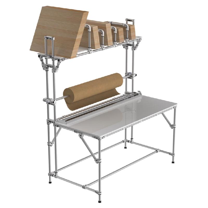 Poste d'emballage complet avec : - 3 types de plateaux au choix : bois, stratifié, mélaminé - Étagères - Panneaux porte - outils et porte - bacs - Supports verticaux pour cartons - Caractéristiques principales : - Châssis : profilé en aluminium anodisé, esthétique, robuste et offrant