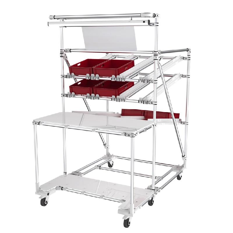 Poste de travail pour assemblage, packaging et contrôle. Pour industrie, logistique et e - commerce. 2 niveaux en tubes pour le glissement en mode FIFO de KLT et boites à fond irréguliers. Les niveaux bas sont configurés en stock et rangement verticaux. Equipé d'un luminaire LED. Plan de travai