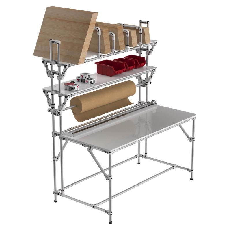 Poste d'emballage. Dérouloir frontal et poste de coupe. Table de travail et niveau supérieur de rangement pour cartons et boites. Réglable et évolutif . Montage sur pieds reglables. - Référence : 71 - 1 - Marque : Trilogiq