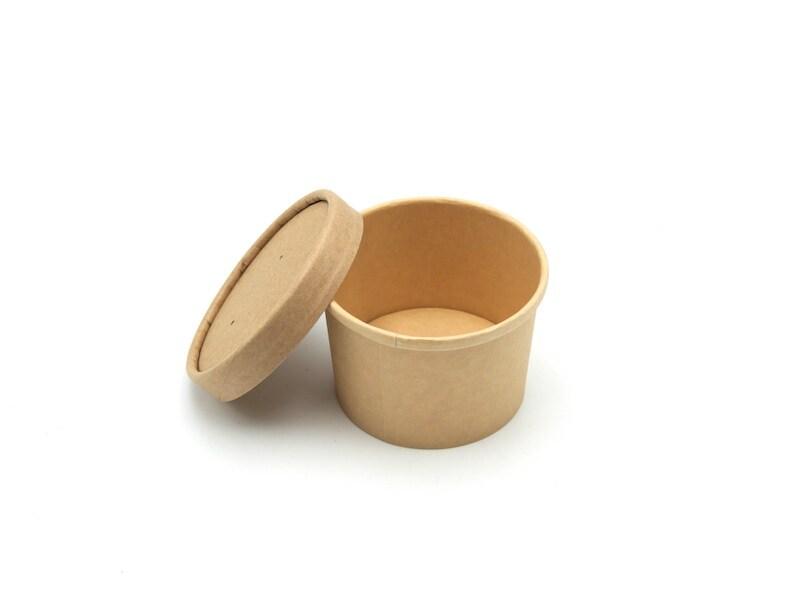 Lot de 50 pots à soupe ou à glace de 120 ml (H65 mm) en carton kraft brun, sans plastique, avec revêtement waterbased. Adaptés au contact alimentaire, ils conviennent aussi bien aux préparations chaudes qu'aux desserts froids. Pratiques pour la vente à emporter, ils permettent de servir et tra
