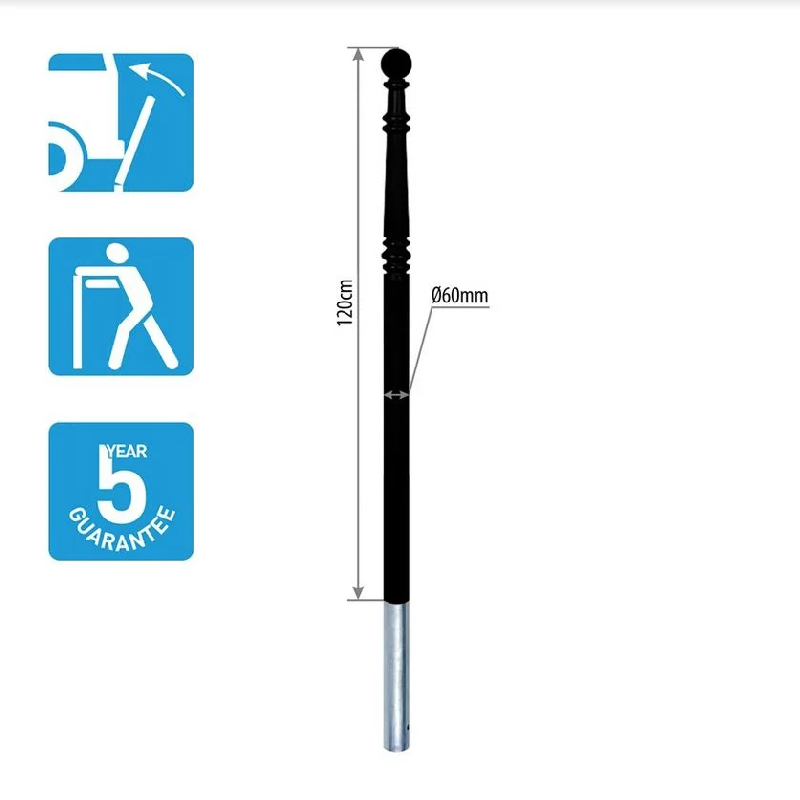Produit : - Matière : élastomère de polyuréthane - Longueurs totales hors tout : 1177 mm et 1400 mm - Teinté dans la masse + laquage de protection (RAL au choix) - Emballage sous housse individuelle - Pose : - Par scellement direct avec insertion d'un fer à béton Ø 10 mm longueur 120 m