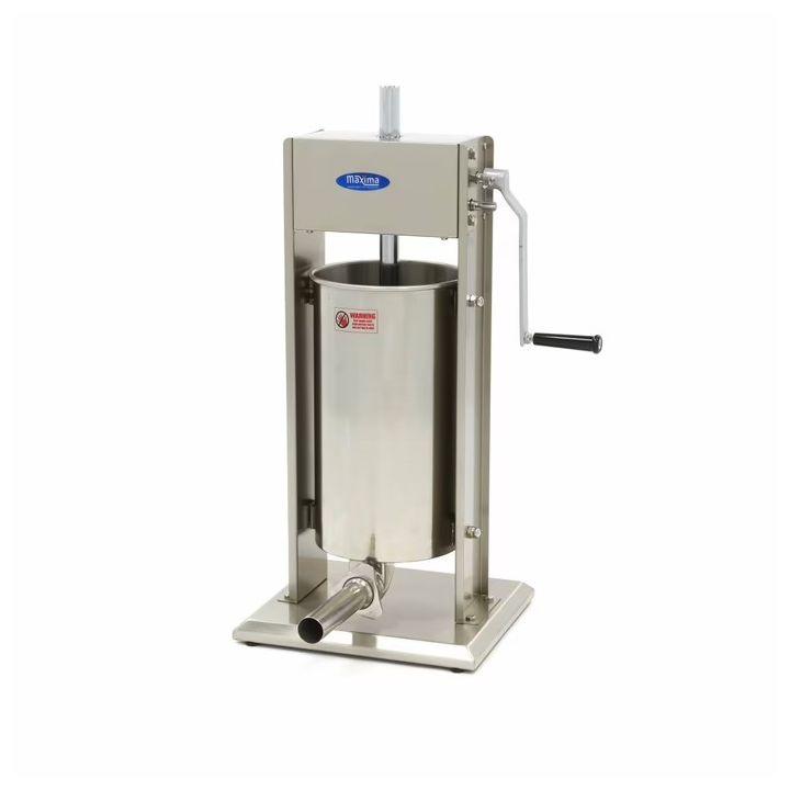 Le poussoir à saucisses professionnel vertical 15 L inox est une machine robuste et performante, spécialement conçue pour la production de grandes quantités de saucisses dans les boucheries, charcuteries, ateliers de transformation et cuisines professionnelles. Grâce à sa grande capacité de 15 litres, il permet de fabriquer efficacement un volume important de saucisses, merguez, chipolatas ou boudins en un seul remplissage. Son système mécanique à deux vitesses manuelles assure un remplissage rapide, fluide et précis : la vitesse lente est parfaite pour les farces épaisses, tandis que la rapide accélère la production sans compromis sur la qualité. Ce modèle vertical compact (48 × 33 × 74 cm) économise de l'espace sur le plan de travail. Sa cuve inclinable simplifie le chargement des ingrédients, et la plaque de pression inox avec trou d'aération et joint d'étanchéité empêche la formation d'air dans les boyaux pour un résultat parfaitement homogène. Livré avec quatre canules inox interchangeables de Ø16, Ø22, Ø32 et Ø38 mm, il s'adapte à tous les calibres de saucisses. Sa structure 100 % inox garantit hygiène, solidité et longévité, tandis que les pièces amovibles lavables au lave-vaisselle facilitent grandement le nettoyage. Ses pieds en caoutchouc antidérapants assurent une stabilité optimale pendant l'utilisation, même à pleine charge. Caractéristiques clés Capacité de remplissage : 15 L Modèle : vertical (de table, compact et ergonomique) Structure : acier inoxydable complet (cuve, boîtier, plaque, visserie) Vitesses : 2 manuelles (remplissage rapide / dosage précis) Cylindre : Ø21,9 × 40 cm, inclinable Sortie cylindre : Ø5 cm Canules fournies : 4 tubes inox Ø16, Ø22, Ø32, Ø38 mm Dimensions extérieures : L 48 × P 33 × H 74 cm Poids net : 17 kg Type d'alimentation : manuelle (aucune électricité requise) Nettoyage : pièces amovibles et lavables au lave-vaisselle Stabilité : 4 pieds en caoutchouc antidérapants Référence produit : 09300465 EAN : 8719632121565 Code SH : 8438500000Avantages produit Haute capacité de 15 L : idéale pour les productions intensives Structure inox complète : hygiène, robustesse et durabilité Double vitesse manuelle : contrôle précis du remplissage Cuve inclinable : chargement et nettoyage simplifiés Plaque de pressage avec trou d'aération pour un remplissage sans bulles 4 canules incluses pour tous calibres de saucisses Entretien simplifié : pièces démontables et lavables au lave-vaisselle Format vertical : gain de place sur le plan de travail Grande stabilité : repose sur quatre pieds antidérapantsFAQ - Questions fréquentes Le poussoir est-il électrique ? Non, il fonctionne manuellement pour un contrôle total du remplissage. Les pièces passent-elles au lave-vaisselle ? Oui, les canules et la cuve amovible sont compatibles lave-vaisselle. Ce modèle est-il adapté à une utilisation intensive ? Oui, il est conçu pour un usage professionnel régulier en boucherie et charcuterie. Quelle est la différence avec le modèle 10 L ? Le modèle 15 L permet de produire encore plus de saucisses par cycle, idéal pour les volumes importants. Recommandations d'utilisation & entretien Choisir la vitesse adaptée selon la texture de la farce. Incliner la cuve avant remplissage pour faciliter le chargement. Nettoyer soigneusement toutes les pièces après chaque usage. Sécher les éléments avant remontage pour préserver l'acier inoxydable. Vérifier et lubrifier la manivelle et les engrenages régulièrement.