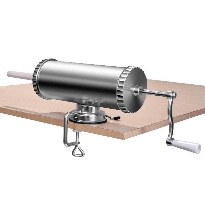 Machine en acier inoxydable de 3 litres Robuste, facile d\'entretien, antirouille et très durable Très stable et facile à manipuler Convient aux familles, bouchers, amateurs et chasseurs Incl. 4 becs de remplissage en PP pour différentes tailles de saucisses Spécifications Capacité: 3 L Poids: