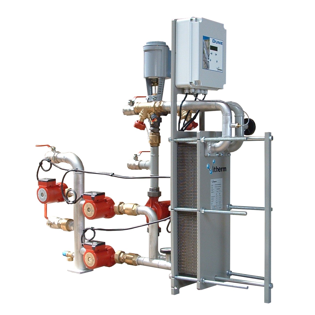 Préparateur à plaques d'ECS instantanée.Puissances de 50 à 1.160 kW. - Pompes protégées et raccordées. - Régulateur électronique entièrement programmable, livré préréglé. - Permutation automatique des pompes doubles. -