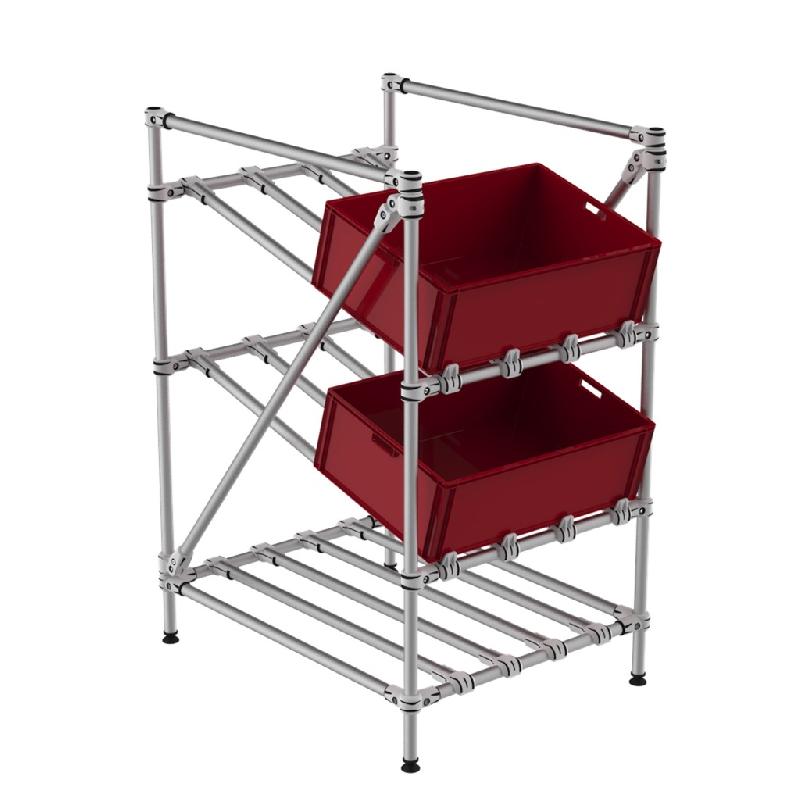 Presentoir à bacs KLT compact à 2 niveaux inclinables et barre stop frontale réglable en hauteur. Structure tubulaire robuste et ajustable. Niveaux réglables en inclinaison et hauteur au sol. Structure en aluminium légère et resistante. Montage sur pieds réglables au sol - Référence : 44 -