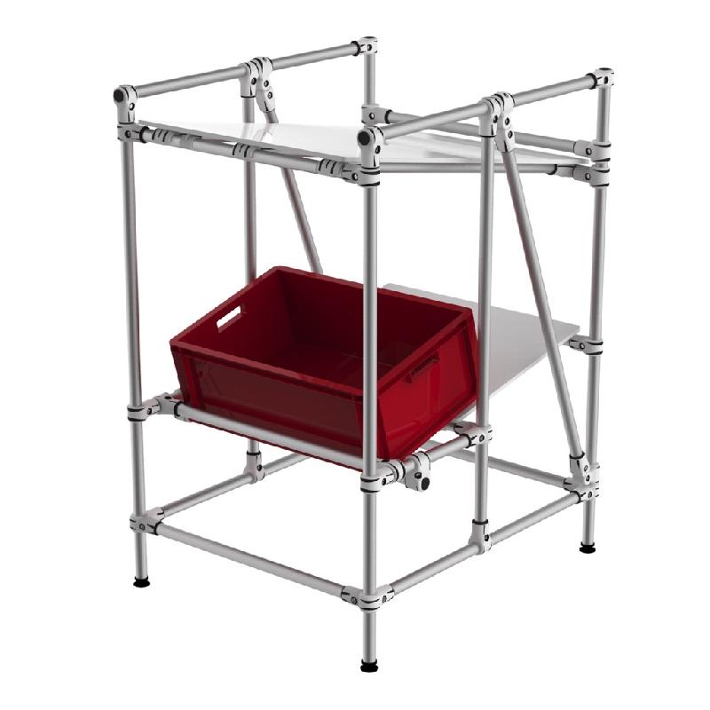 Présentoir pour boites, cartons et KLT à 2 niveaux dont 1 niveau retour. Monté sur pieds réglables. Niveaux réglables en hauteur pour ergonomie adaptative. Système de picking frontal à inclinaison variable. Plaques PVC mat blanches et construction Aluminium. Charge 150 kg par niveau en modèle standard.