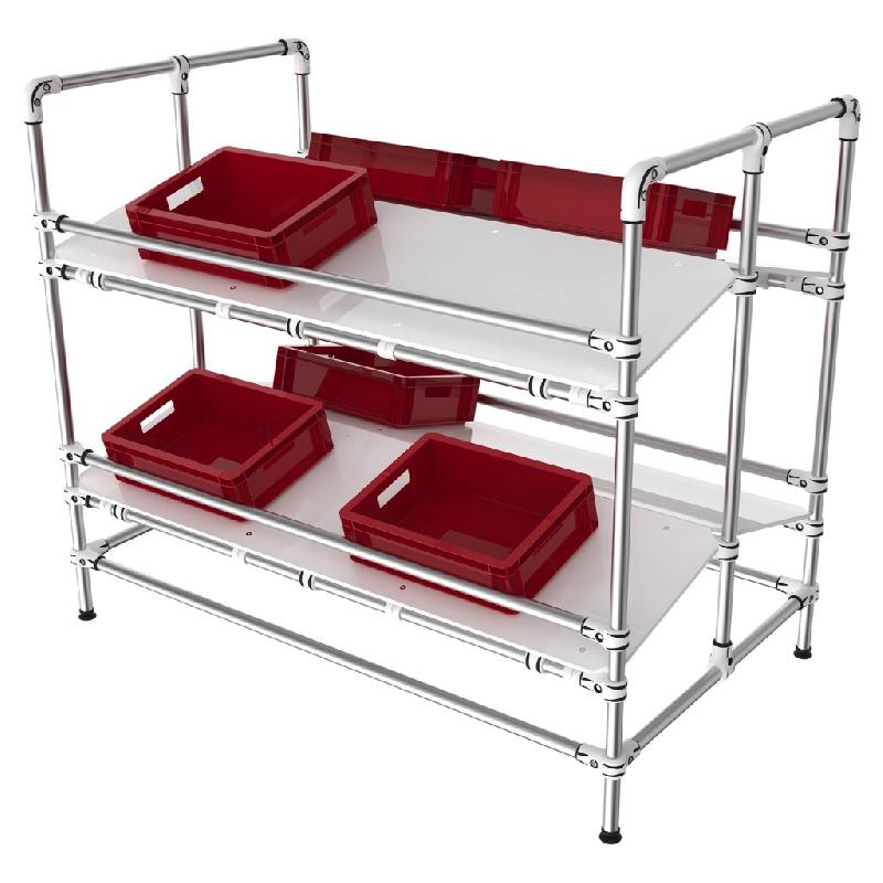 Présentoir pour boites, cartons et KLT à 2 niveaux dont 1 niveau retour. Monté sur pieds réglables. Niveaux réglables en hauteur pour ergonomie adaptative. Système de picking frontal à inclinaison variable. Plaques PVC mat blanches et construction Aluminium. Charge 150 kg par niveau en modèl
