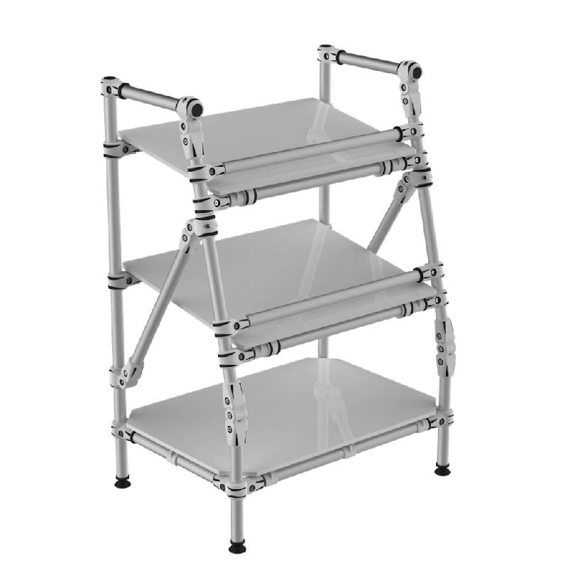 Présentoir compact à 3 niveaux inclinables et barre stop frontale réglable en hauteur. Structure ergonomique frontale à angle pour meilleure ergonomie. Niveaux réglables en inclinaison et hauteur au sol. Structure en aluminium légère et resistante. Montage sur pieds réglables au sol