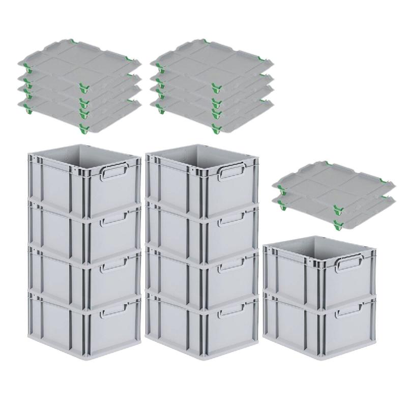 Avec poignées ouvertes ou fermées - Coloris : gris clair - FABRICATION CE - Les bacs Euro Normes, de fabrication robuste - Bacs euro avec couvercle et poignée