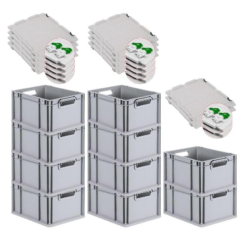 Avec poignées ouvertes ou fermées - Coloris : gris clair - FABRICATION CE - Les bacs Euro Normes, de fabrication robuste - Bacs euro avec couvercle et poignée