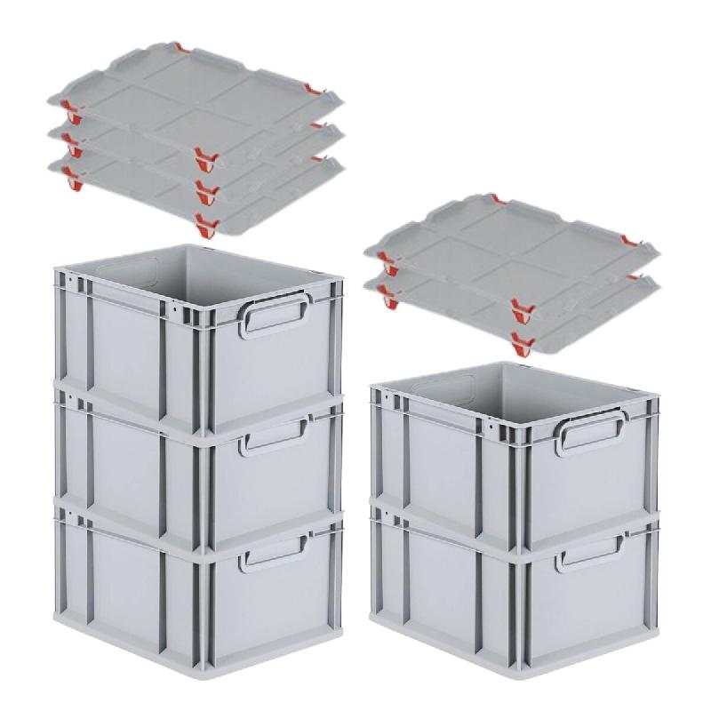 Avec poignées ouvertes ou fermées - Coloris : gris clair - FABRICATION CE - Les bacs Euro Normes, de fabrication robuste - Bacs euro avec couvercle et poignée