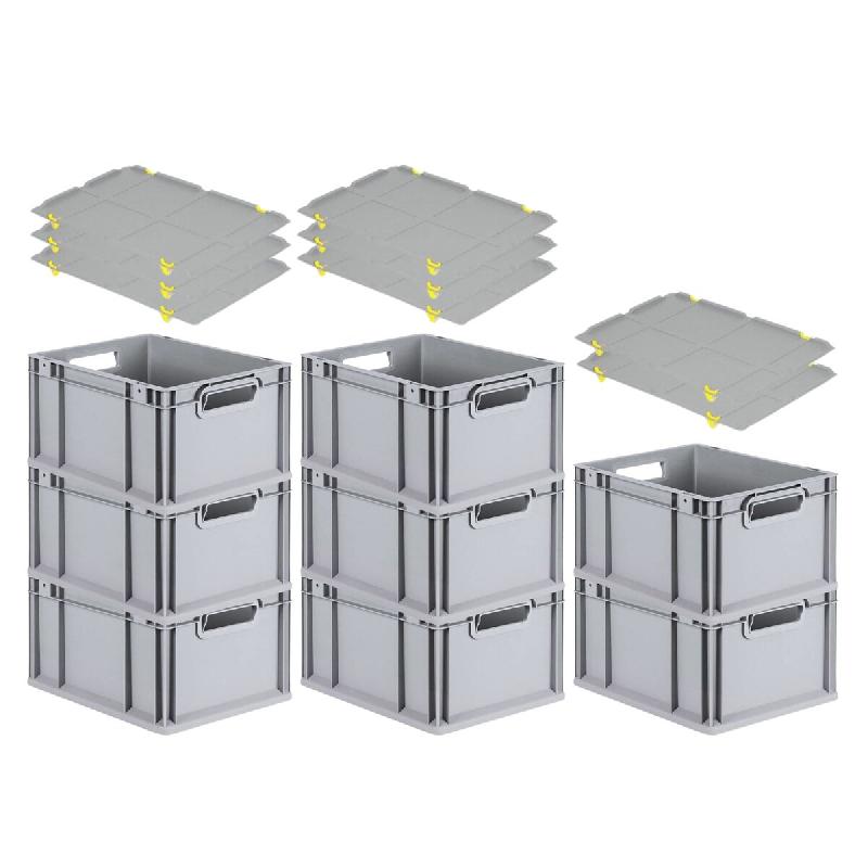Avec poignées ouvertes ou fermées - Coloris : gris clair - FABRICATION CE - Les bacs Euro Normes, de fabrication robuste - Bacs euro avec couvercle et poignée