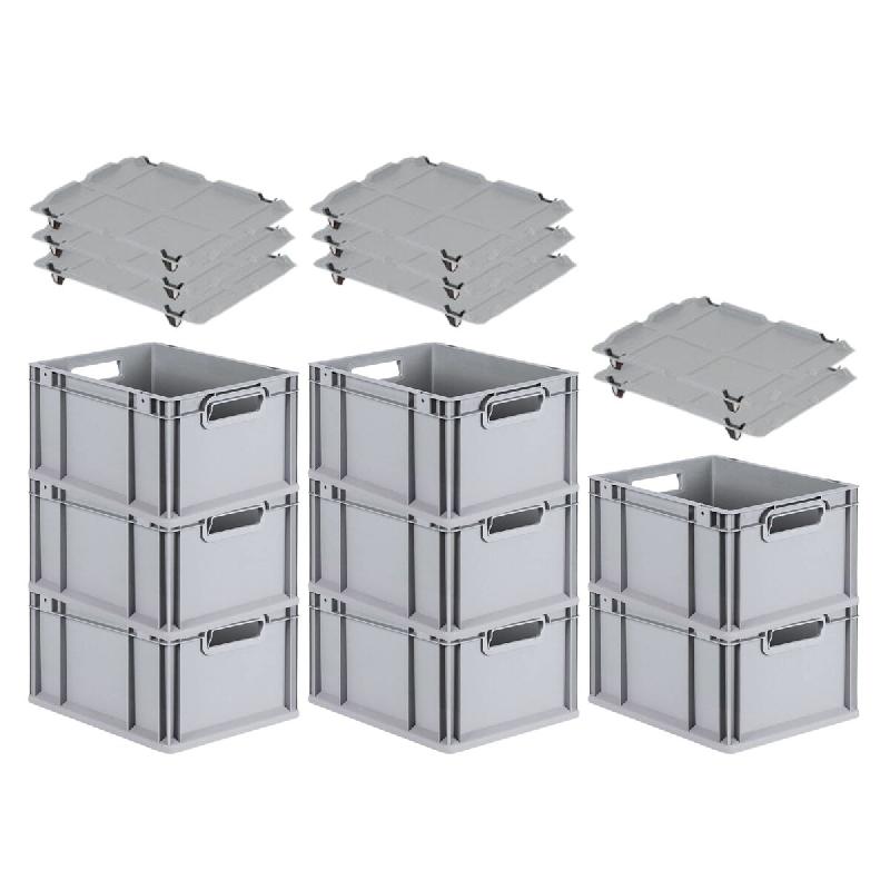 Avec poignées ouvertes ou fermées - Coloris : gris clair - FABRICATION CE - Les bacs Euro Normes, de fabrication robuste - Bacs euro avec couvercle et poignée