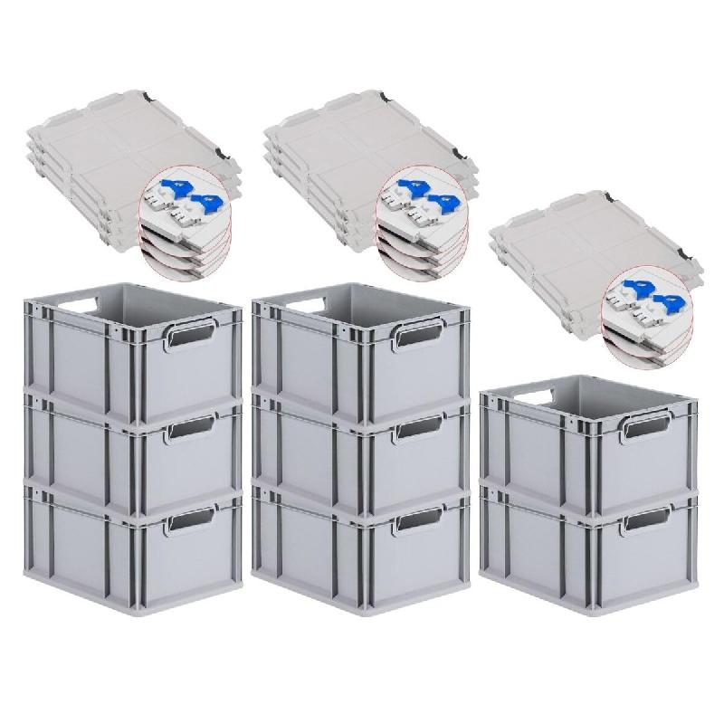 Avec poignées ouvertes ou fermées - Coloris : gris clair - FABRICATION CE - Les bacs Euro Normes, de fabrication robuste - Bacs euro avec couvercle et poignée