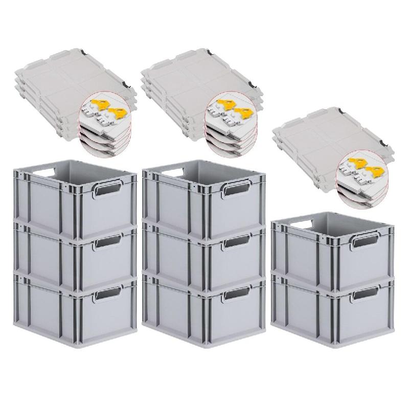 Avec poignées ouvertes ou fermées - Coloris : gris clair - FABRICATION CE - Les bacs Euro Normes, de fabrication robuste - Bacs euro avec couvercle et poignée