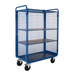 Chariot industriel 3 côtés grillagés pour protéger vos produits sensibles. - Construction en tube d'acier rond. - Structure non blessante. - Recouvrement de la base par un plateau bois multiplis antidérapant. Panneau résistant à l'humidité, aux chocs et aux rayures. - 2 roulettes fixes +
