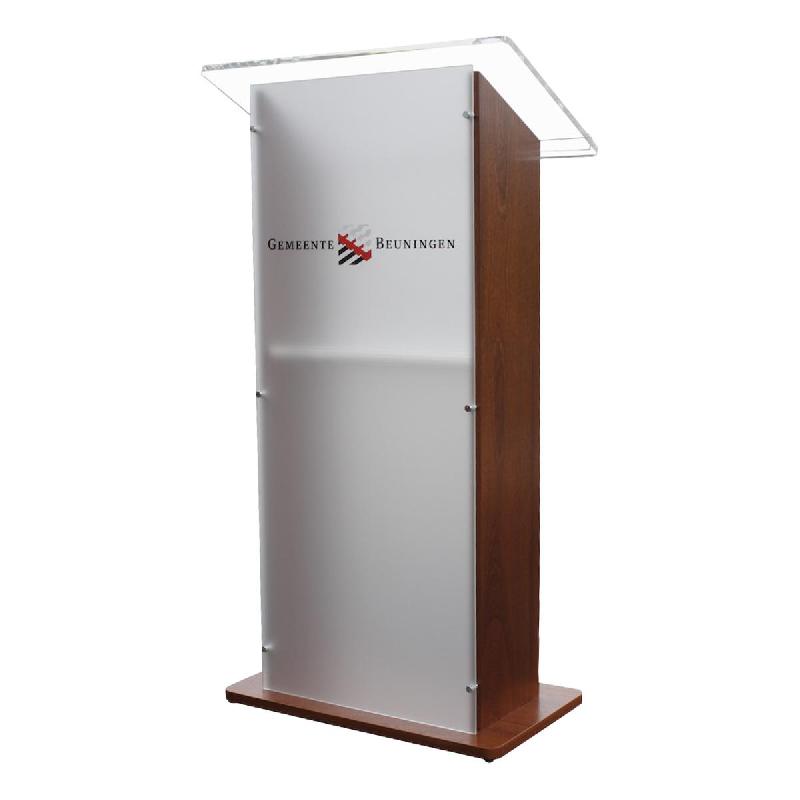 La combinaison de bois véritable et d'acrylique confère au pupitre son design unique. Choisissez une façade transparente ou satinée et laissez-nous y apposer votre logo. Choisissez la couleur de bois qui convient le mieux à votre intérieur.