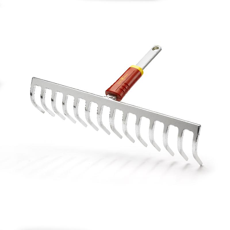 - Dents courbes spécialement adaptées au ratissage de la terre, permettant d'égaliser, de préparer ou de recouvrir les semis.