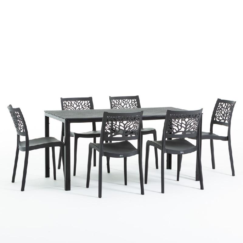 RATTATAN Ensemble repas de jardin avec table rectangulaire à structure en acier et 6 chaises monobloc en résine empilables – Thomas + Flora / Noir