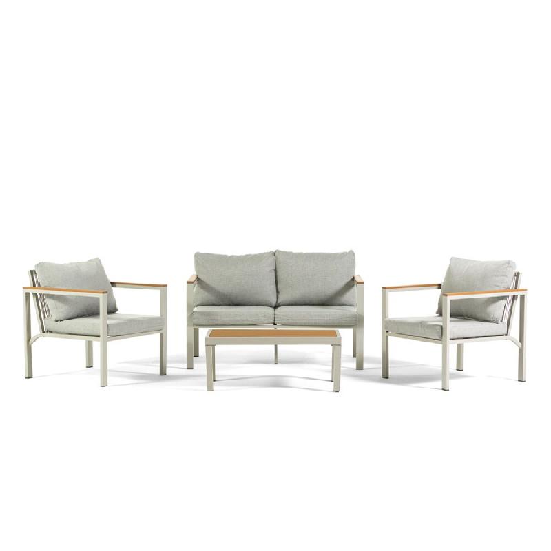 RATTATAN Salon de jardin avec canapé 2 places, 2 fauteuils et table basse en acier corde polywood avec coussins pour jardin terrasse - Ravello - grei