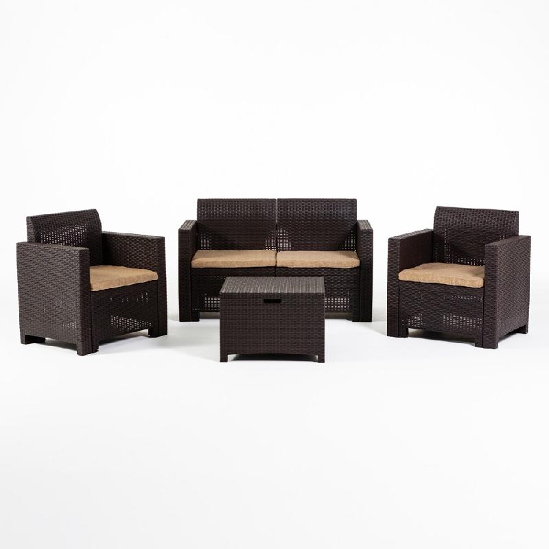 Le set de salle à manger LUGANO en résine effet rotin est composé de deux fauteuils, d'un canapé deux places et d'une table coffre. - Très facile à monter et à nettoyer. - Son design ergonomique et les quatre coussins d'assise le rendent encore plus confortable et relaxant. - Idéal pour a