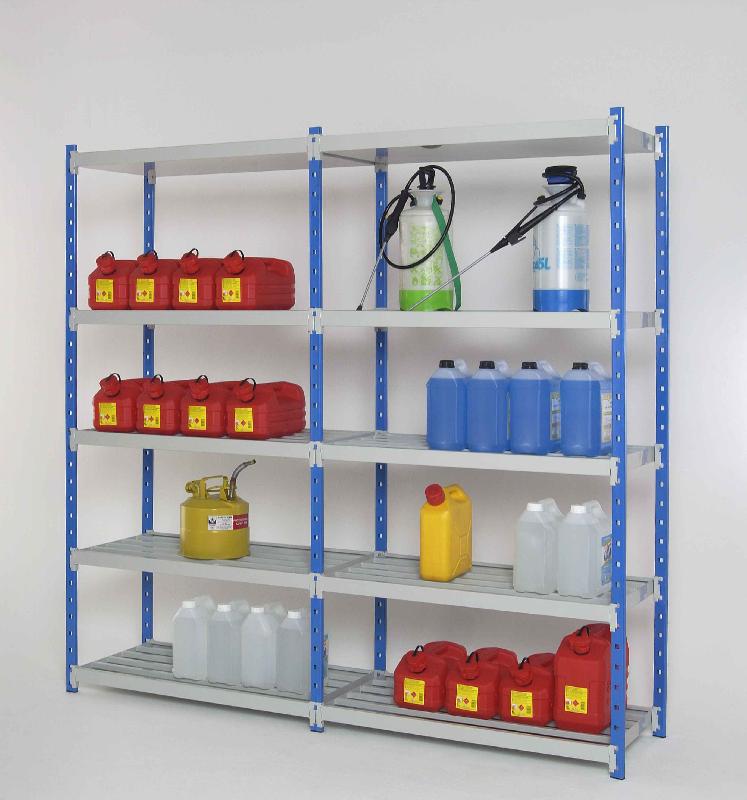 Rayonnage acier FLIP - 5 niveaux - profondeur 400 mm - largeur 1000 mm - hauteur 2000 mm. Idéal pour le stockage de produits polluants NON corrosif.