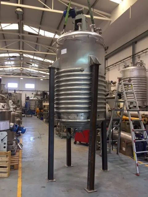 Réacteur de 2550 litres fabriqué par Aguilar y Salas en 1997. Fabriqué en acier inoxydable. Avec agitation type hélice double flux et demi-tige. Avec 3 disjoncteurs de courant. Milieux Klopper. Bride de refoulement avec diamètre intérieur de 50 mm en bas. Regard diamètre 450 mm, 1 bride, 5 buses et 2 oreilles en fond supérieur. Sur 4 pattes. Poids : 700 kg. Caractéristiques du corps : Température de conception : 200°C Pression de conception : -1/1 bar Pression d'essai : 1,48 bar Capacité : 2300 L Caractéristiques demi-ronde : Température de conception : 100°C Pression de conception : 6 bar Capacité : 100 L Dimensions général (environ) : Hauteur totale : 4100 mm Hauteur du corps : 1750 mm Diamètre du corps : 1200 mm Hauteur des pieds : 2500 mm Hauteur de déchargement par le bas : 1000 mm