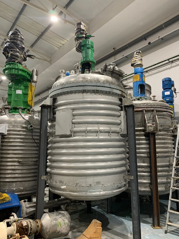 Réacteur vertical en acier inoxydable 316 d'une capacité totale de 5 000 litres (4 000 utiles). L'équipement dispose d'un agitateur, d'une demi - barre et de trois disjoncteurs de courant à l'intérieur.Klopper fond supérieur vissé au corps avec trou d'homme, 5 raccords type bride et agitation