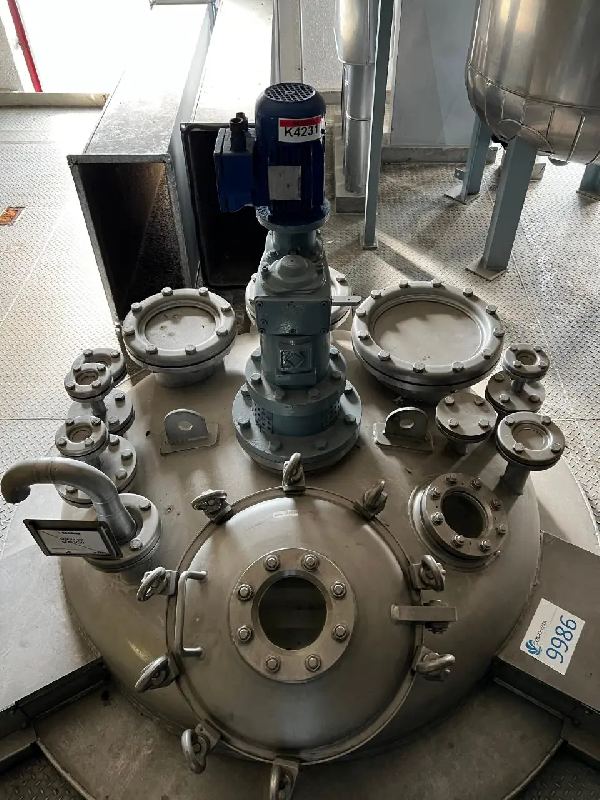 Réacteur vertical en acier inoxydable 316 d'un volume de 4 000 litres. Fond supérieur sphérique vissé au corps avec trou d'homme avec couvercle ouvrant et fermetures manuelles, agitation double flux type hélice bipale avec racleurs à 4 hauteurs, 2 raccords type NW et un foyer. - Corps avec c