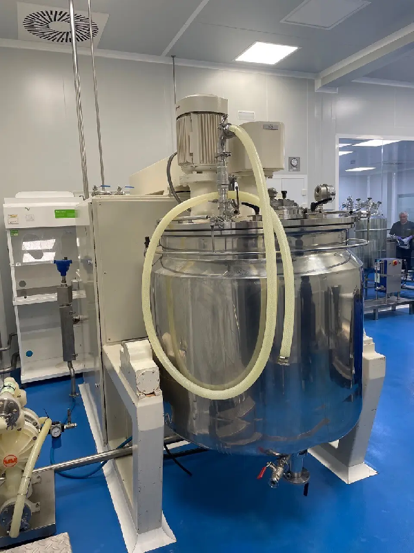 Réacteur en inox 316 d'une capacité totale de 2000 litres avec agitation et demi - fût. Fond supérieur Klopper vissé au corps avec trou d'homme, bride centrale avec agitation, voyant et buses à bride. - Corps et fond inférieur conique avec demi - tige. - Fond inférieur conique avec décha