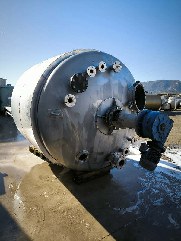 Réacteur vertical fabriqué en acier inoxydable par AGUILAR Y SALAS en 2000. D'une capacité totale de 5 100 litres (4 000 utiles), l'équipement dispose d'un serpentin interne, d'un demi - bec dans le corps et dans le fond inférieur, et d'un réservoir de 4 pouces. Agitation de type hélice. Corp