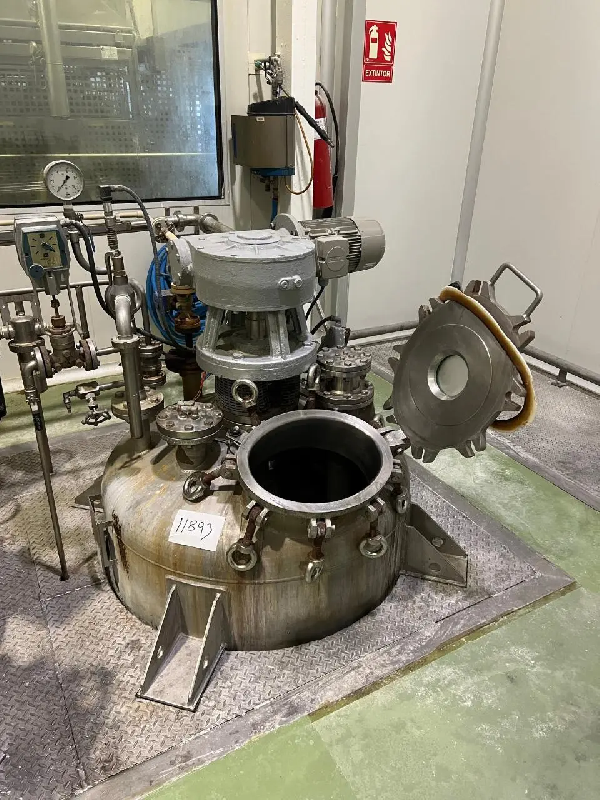 Réacteur en acier inoxydable d'une capacité de 500 litres. Fond supérieur avec trou d'homme de 400 mm de diamètre avec trois boulons. Bouche d'entrée supplémentaire de 30 mm de diamètre. Sonde de température jusqu'à 100°C. Sonde d'incorporation du produit lors de la dispersion. 2 résist