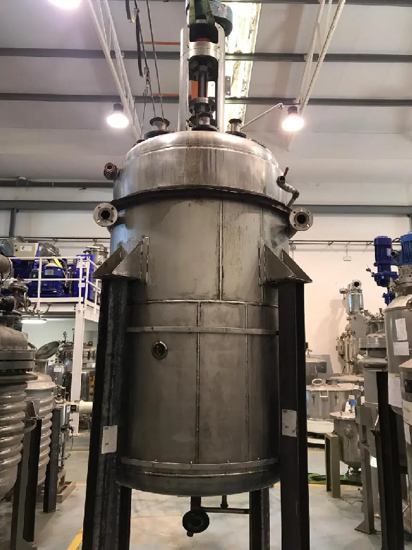 Réacteur vertical en acier inoxydable 316 d'une capacité totale de 5 000 litres (4 000 utiles). L'équipement dispose d'un agitateur, d'une demi - barre et de trois disjoncteurs de courant à l'intérieur.Klopper fond supérieur vissé au corps avec trou d'homme, 5 raccords type bride et agitation