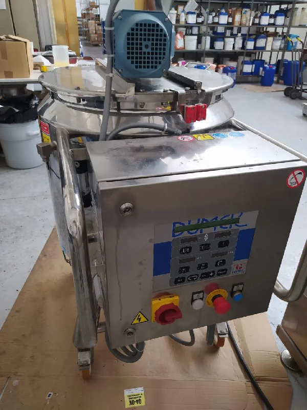Réacteur en acier inoxydable d'une capacité de 120 litres de la marque DUMEK, modèle MELTER 120. Equipé de : Agitateur de type ancre Panneau de commande pour le contrôle de la vitesse et de la température de l'enveloppe par résistance électrique. Vanne de décharge manuelle Sécurité du couvercle Sur roulettes Logiciel pour l'industrie 4.0