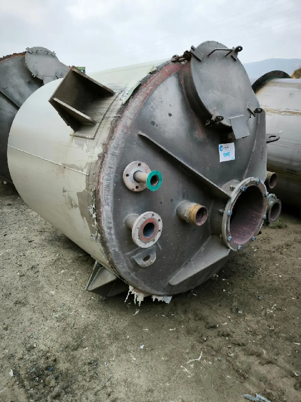 Réacteur en inox 316 d'une capacité totale de 2000 litres avec agitation et demi - fût. Fond supérieur Klopper vissé au corps avec trou d'homme, bride centrale avec agitation, voyant et buses à bride. - Corps et fond inférieur conique avec demi - tige. - Fond inférieur conique avec décha