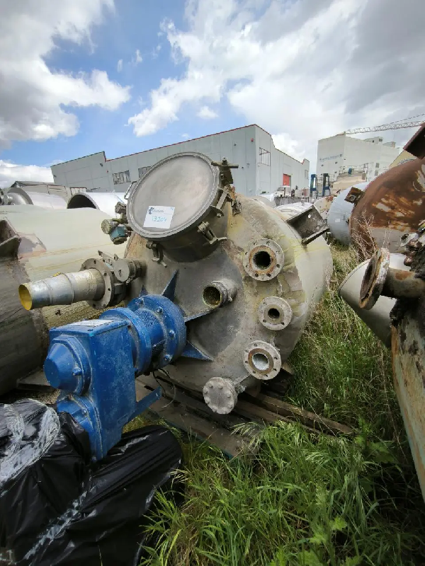 Réacteur vertical en acier inoxydable d'une capacité de 2 500 litres. Monté sur 4 pieds en fer. Milieux Klopper. Avec chemise et agitation. Tuyaux et trou d'homme en haut de l'arrière - plan. Bride de décharge en bas. Caractéristiques du moteur d'agitation triphasé : Tension 220/380 V