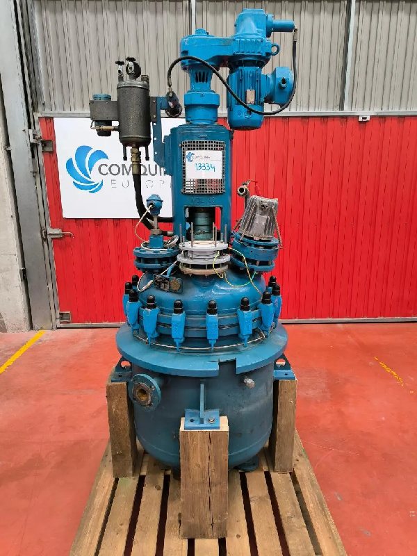 Réacteur en inox 316 d'une capacité totale de 2000 litres avec agitation et demi - fût. Fond supérieur Klopper vissé au corps avec trou d'homme, bride centrale avec agitation, voyant et buses à bride. - Corps et fond inférieur conique avec demi - tige. - Fond inférieur conique avec décha
