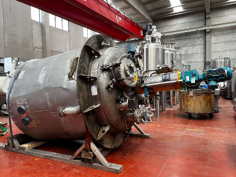 Réacteur vertical en acier inoxydable 316 d'une capacité totale de 5 000 litres (4 000 utiles). L'équipement dispose d'un agitateur, d'une demi - barre et de trois disjoncteurs de courant à l'intérieur.Klopper fond supérieur vissé au corps avec trou d'homme, 5 raccords type bride et agitation