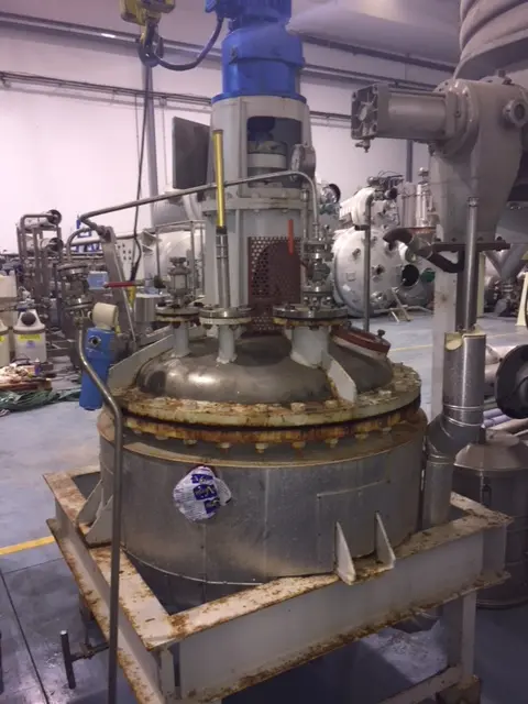 Réacteur de 500 litres fabriqué en acier inoxydable 316 par SCHRADER en 1999. Avec agitation de type ancre et chemise. Environ 4 cartouches. Fond conique. Avec sortie en bas. Avec 7 tubes et 2 oreilles en haut en bas. - Caractéristiques générales : - Corps : - Pression de conception : - 1/+