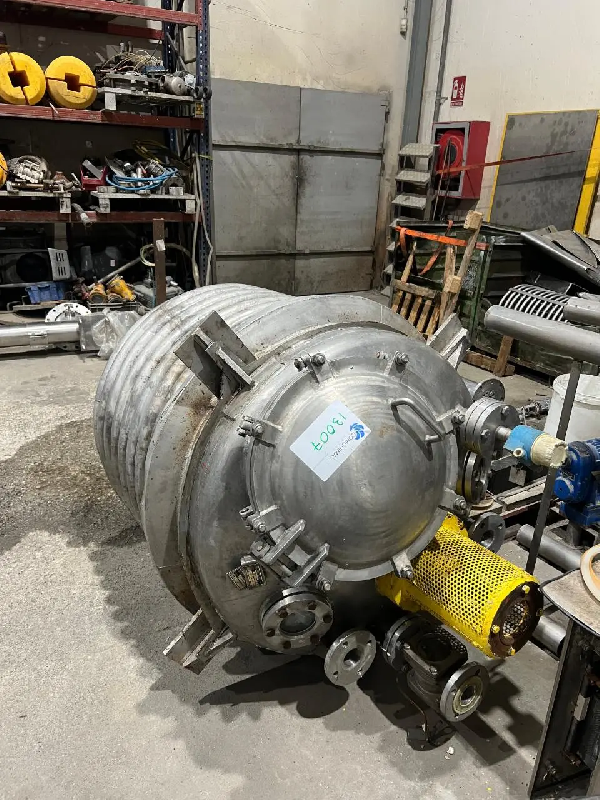 Réacteur en acier inoxydable avec agitation et demi - fût d'une capacité totale de 14 000 litres. Fond supérieur Klopper avec bride centrale pour agitation, trou d'homme et raccords. - Corps et fond inférieur avec demi - tige. - Fond inférieur Klopper. Environ 4 cartouches. - Référence