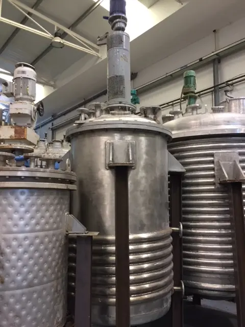 Volume : 1000 litres Position : verticale Matériau : acier inoxydable 316 Réacteur atmosphérique Avec demi-tige pour huile thermique ou eau chaude Sur 4 soufflets Fond Klopper Mesures : Diamètre : 960 mm Longueur du corps : 1530 mm Hauteur totale : 1750 mm env.
